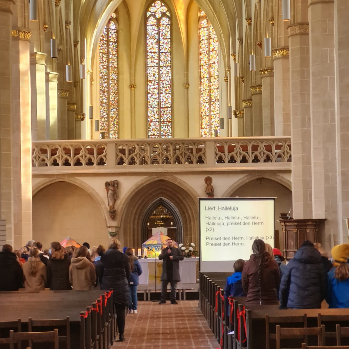 Am Mittwoch (10.11.) feierten die 5. und 6. Klassen in der evangelischen Predigerkirche Martini. Dafür hatte die Klasse 6E gemeinsam mit ihrer Klassenlehrerin Frau Bargfeld ein modernes Martinsspiel eingeübt.