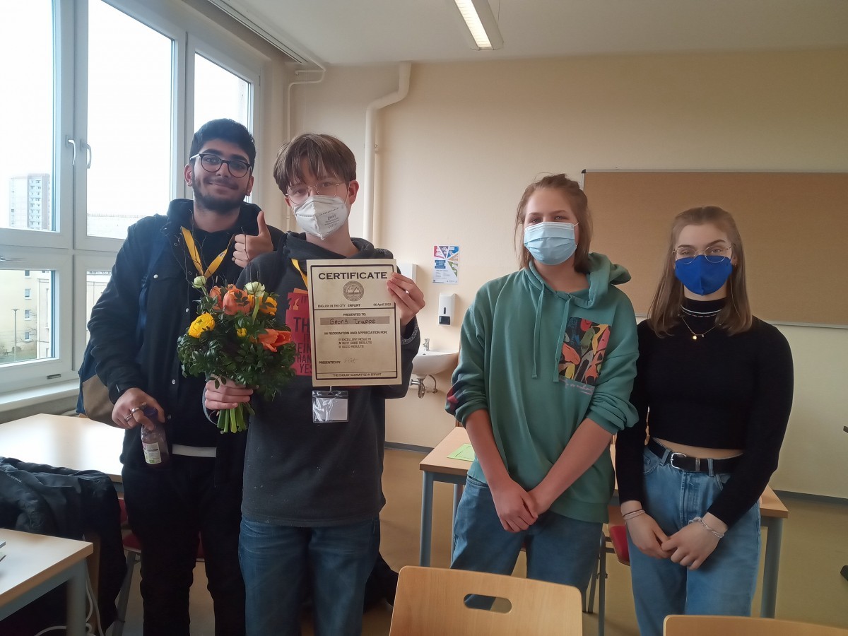 Nach einer zweijährigen virusbedingten Pause war es endlich wieder so weit: Am Mittwoch, dem 6. April, gab es endlich wieder den Wettbewerb „English in the City“. Hier messen Schüler*innen der neunten Klassen der Stadt Erfurt ihr Können in Englisch. Von jeder Schule dürfen 4 Schüler*innen teilnehmen. Vier Tests auf einem hohen Niveau galt es zu absolvieren: im englischen Schreiben, Hören, Konversation und in Landeskunde.